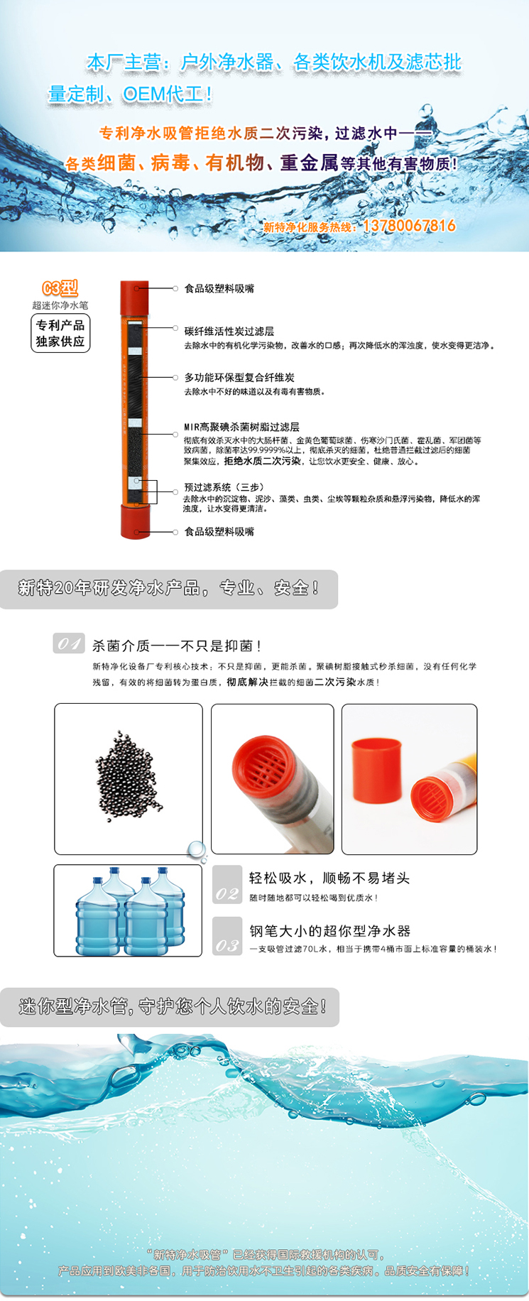 • B3型个人便携式户外净水器 野外生存应急净水吸管 B3型个人便携式户外净水器 野外生存应急净水吸管 B3型户外个人生存净水器采用高聚碘杀菌树脂过滤层+颗粒椰壳活性炭过滤层+碳纤维活性炭过滤层+高精度亲水超滤膜结构,规格尺寸180×Φ23mm,重量净重55g毛总70g,颜色为天蓝色,深蓝色,军绿色等多种可选,使用寿命2000L.